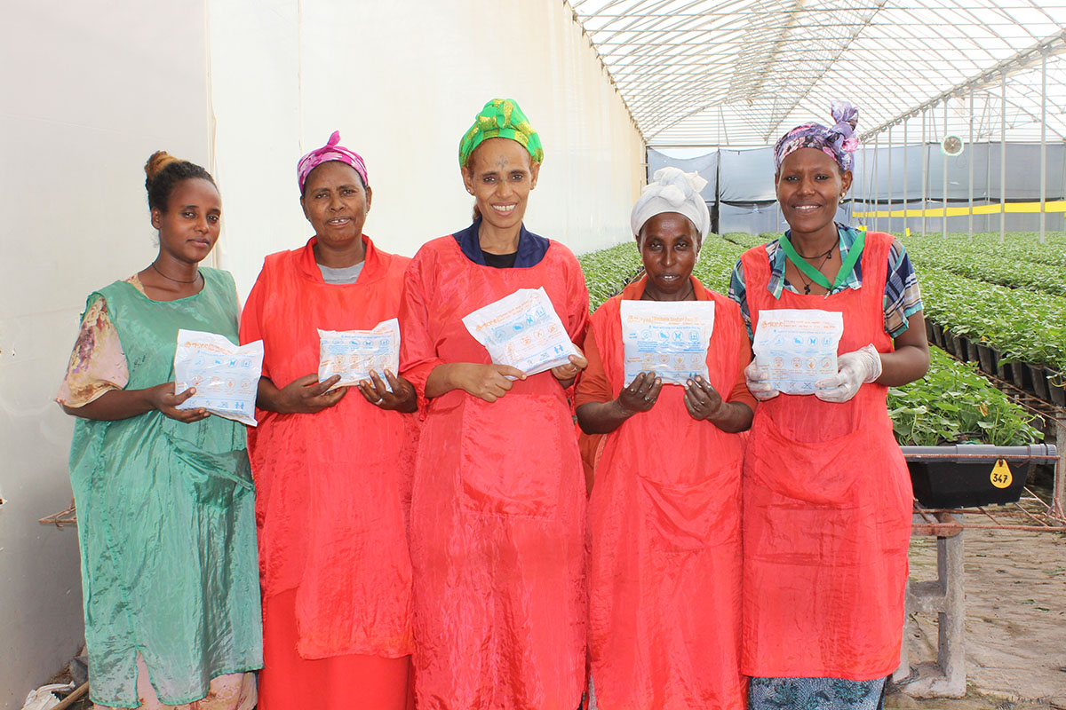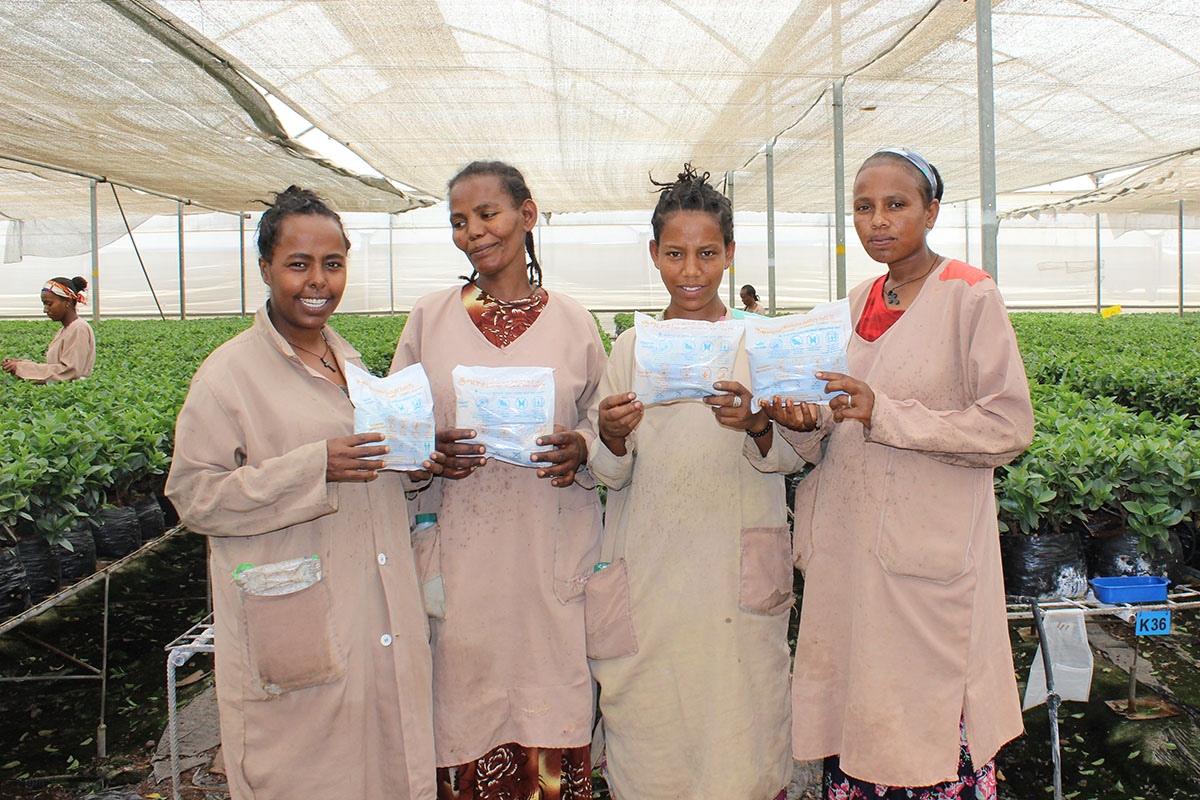 期間中、お客さまにご購入いただいた「インフィニティ ロイヤルフラワーコレクション ⅩⅣ」対象商品1点につき、アフリカのバラ農園で働く女性に再利用可能な生理用品を寄付し、経済的負担の軽減や生活環境の改善などを支援していきます。